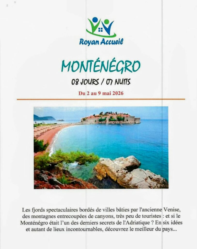 Pour les adhérents Royan Accueil – MONTENEGRO du 2 au 9 Mai 2026 . Prix : 1 650 €...