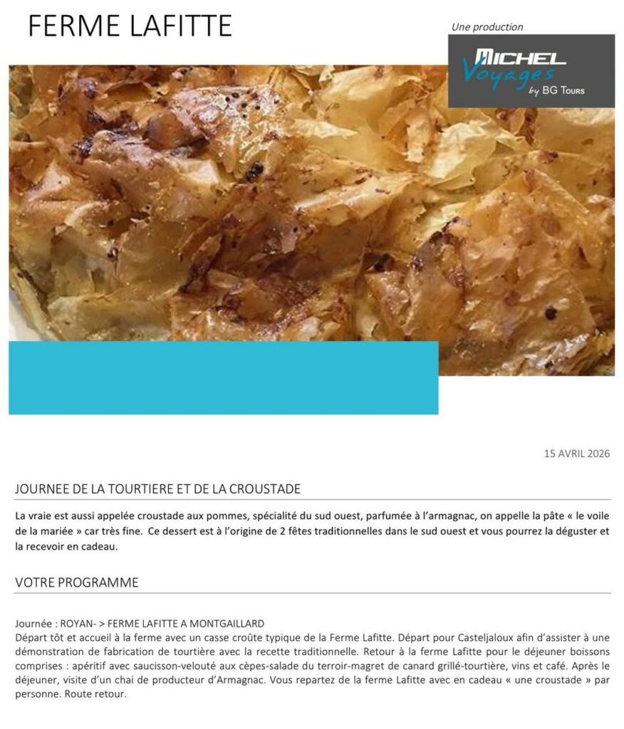 Pour les adhérents de Royan Accueil. Programmation d’une sortie journalière. – FERME LAFITTE, le 15 Avril 2026. Prix: 116...