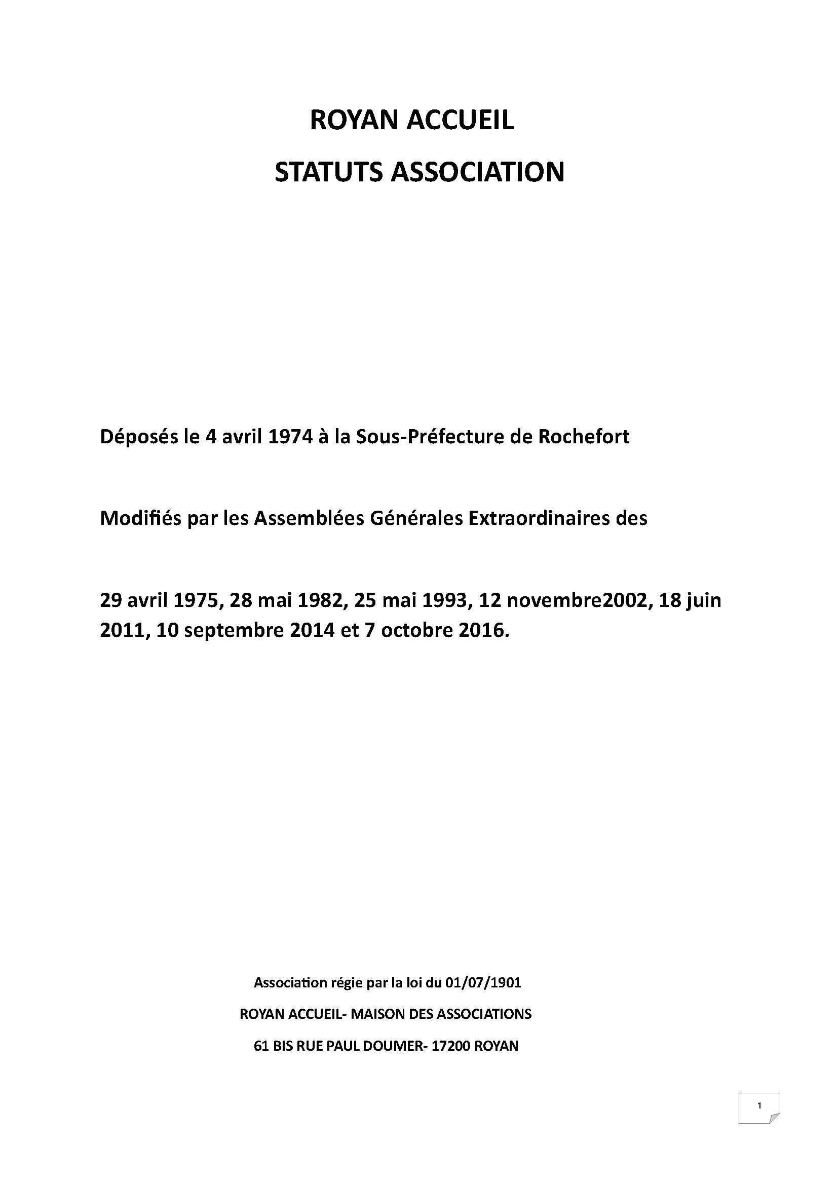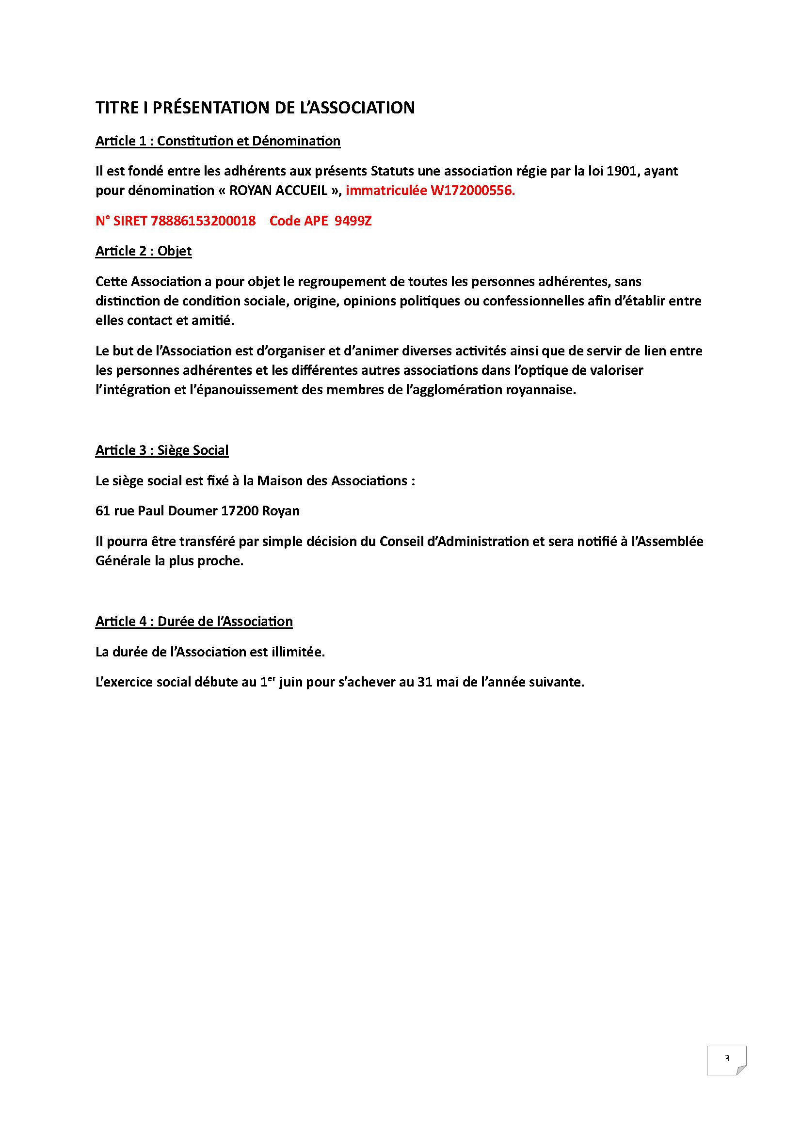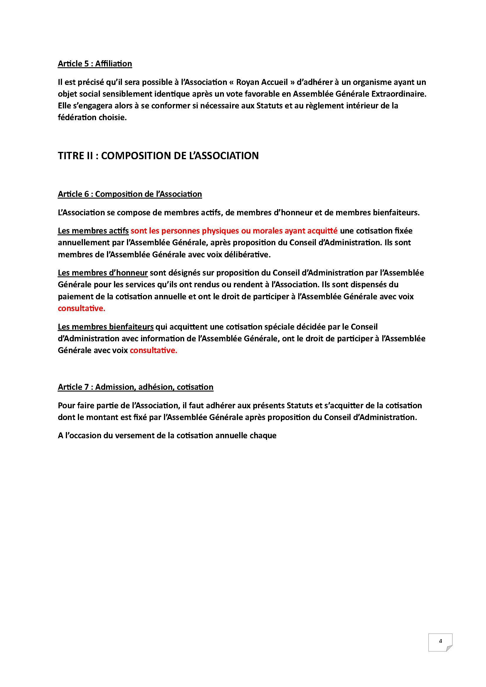MODIFICATIONS DES STATUTS DE L’ASSOCIATION ROYAN ACCUEIL 2 juin 2024 Christian MODIFICATIONS DES STATUTS DE L’ASSOCIATION ROYAN ACCUEIL A VOTER LORS DE L’ASSEMBLÉE EXTRAORDINAIRE DU 20 JUIN 2024 Les modifications par rapport à l’ancienne édition ont été écrites en rouge Share:
