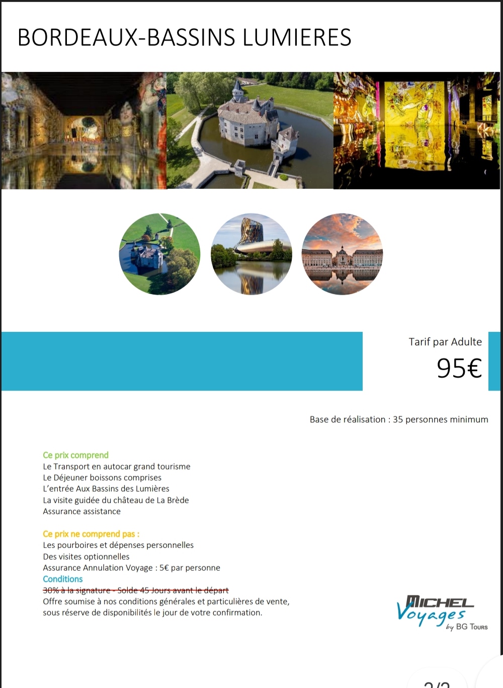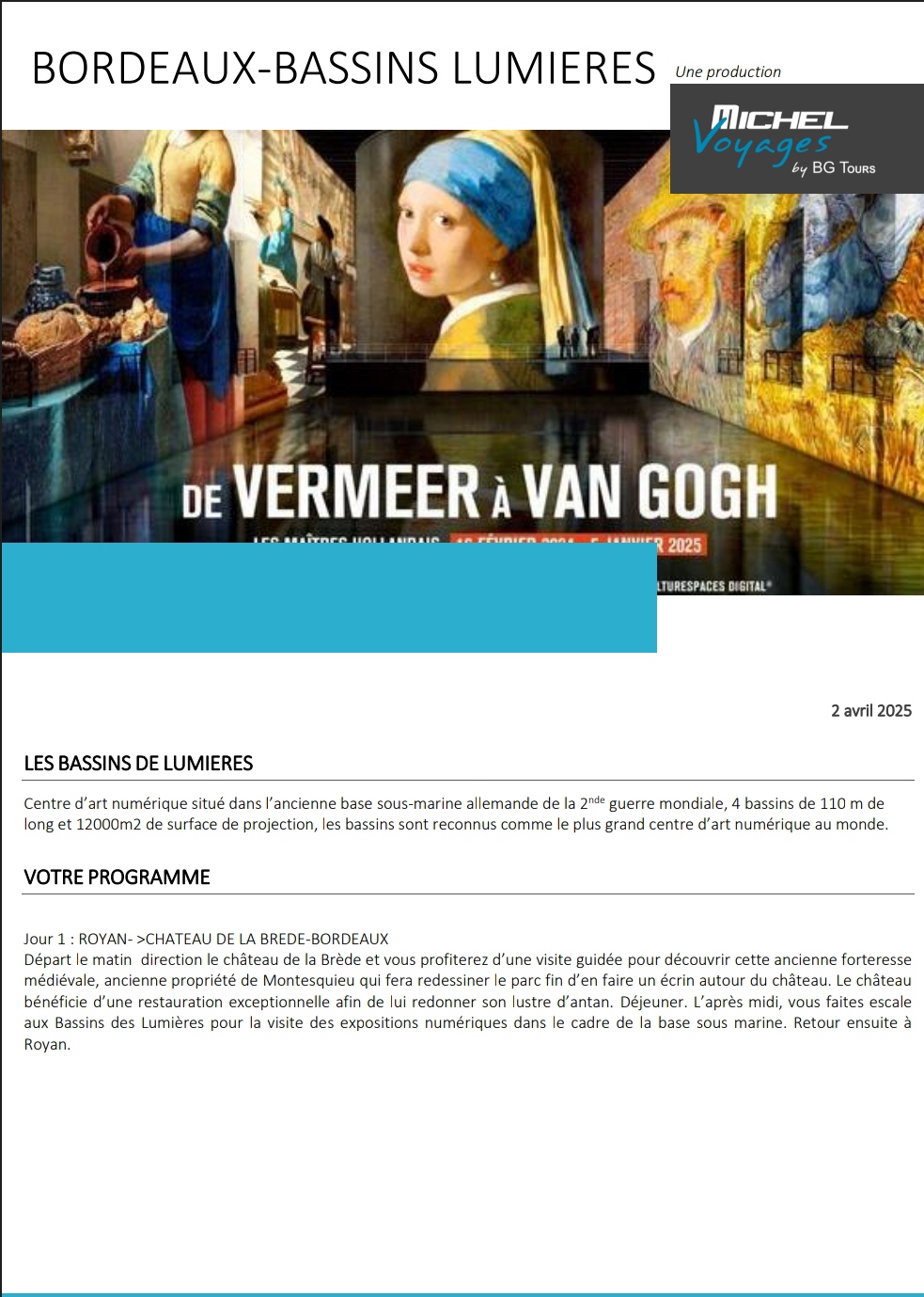 – Sortie à Bordeaux – les bassins de lumières , visite du château de la Bréde, déjeuner au château , Mercredi 2 Avril 2025. Prix : 95 € / personne.