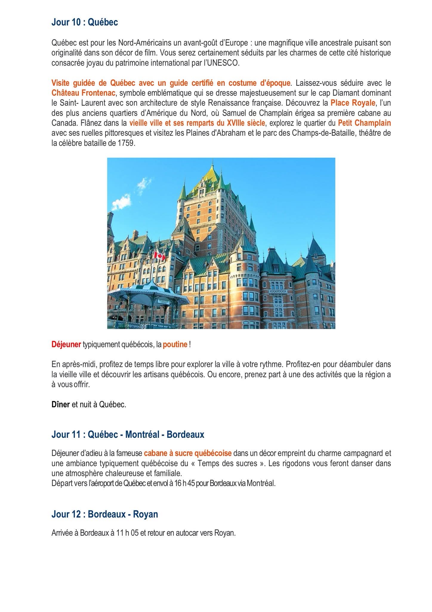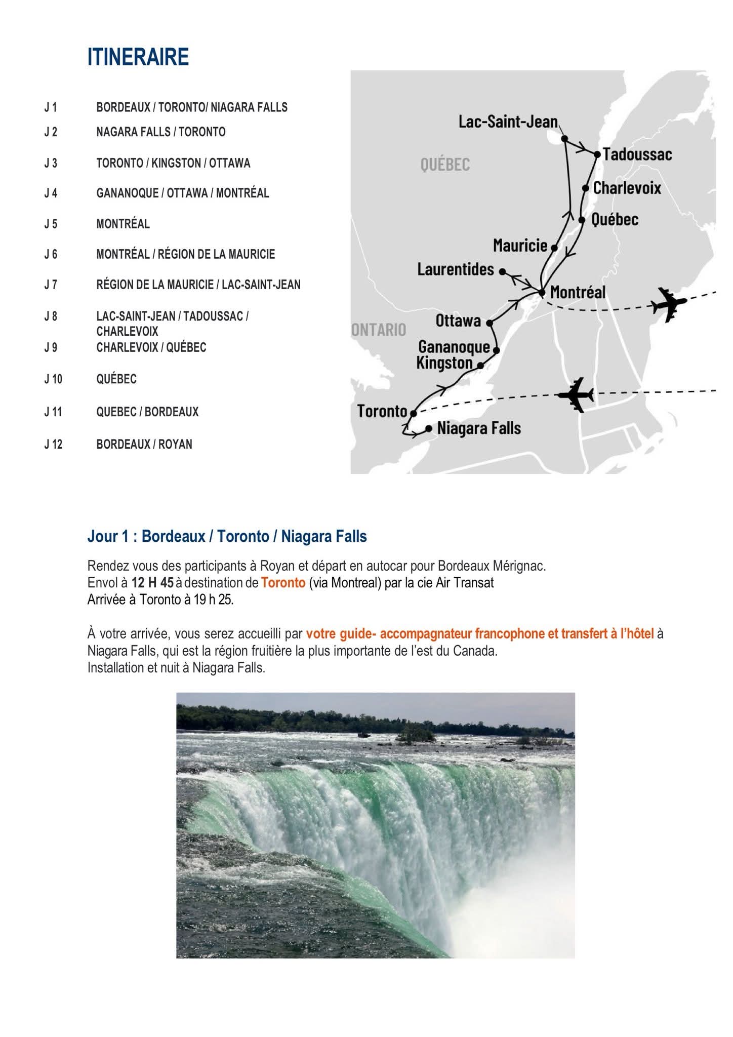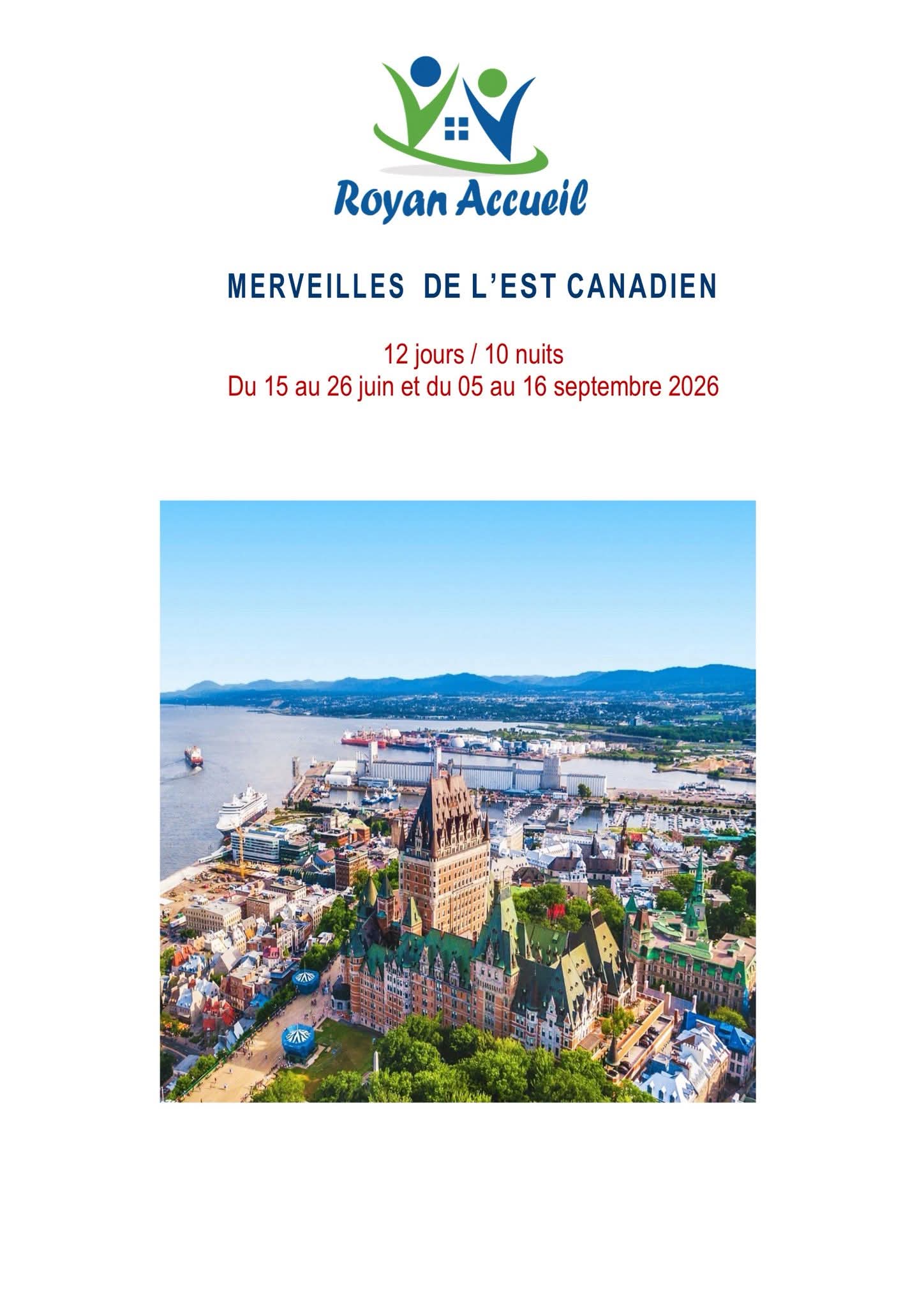 Voyage au CANADA du 15 au 26 Juin 2026 et du 5 au 16 Septembre 2026. Prix : 2 980 € / personne ( Voir Programme en pièce jointe ) Inscriptions le 23, 25 et 30 Septembre 2025 à l’Espace Royan Accueil , Rue Notre Dame 17 200 ROYAN ( 35 Participants maximum par Voyage. )