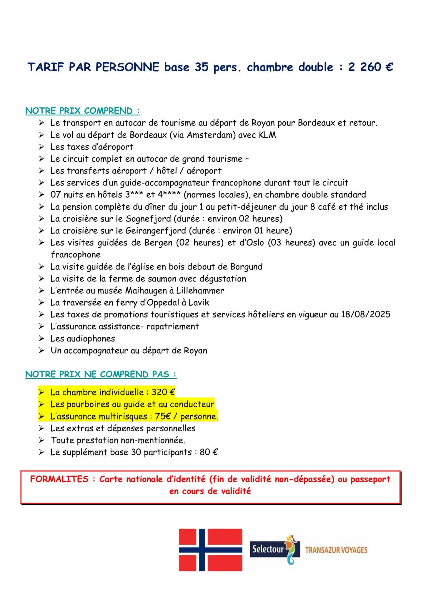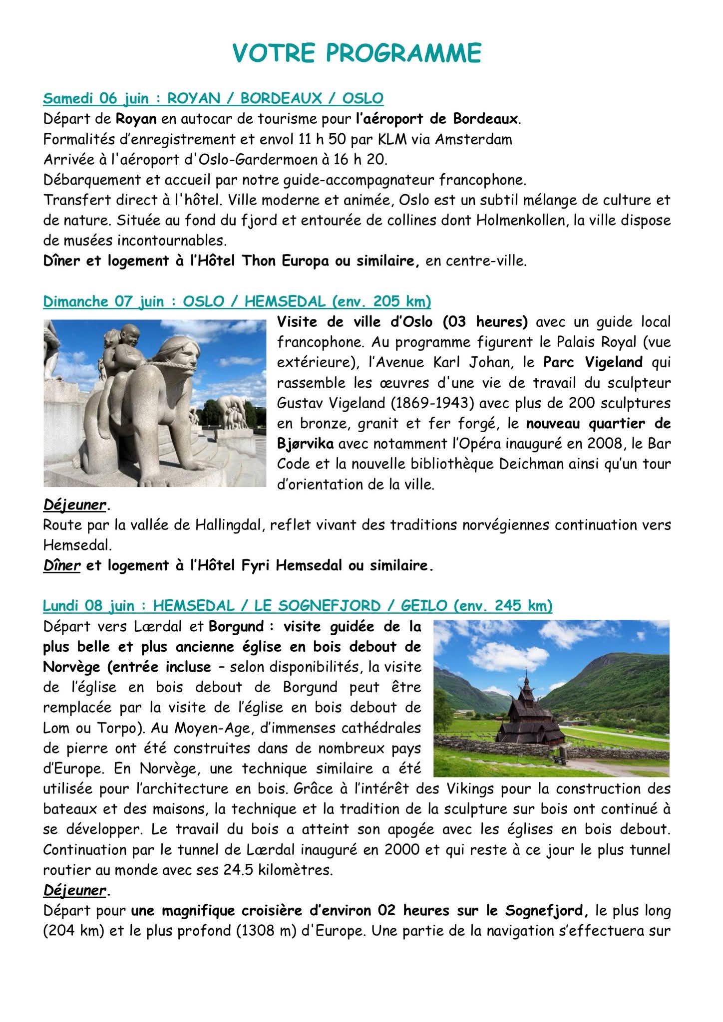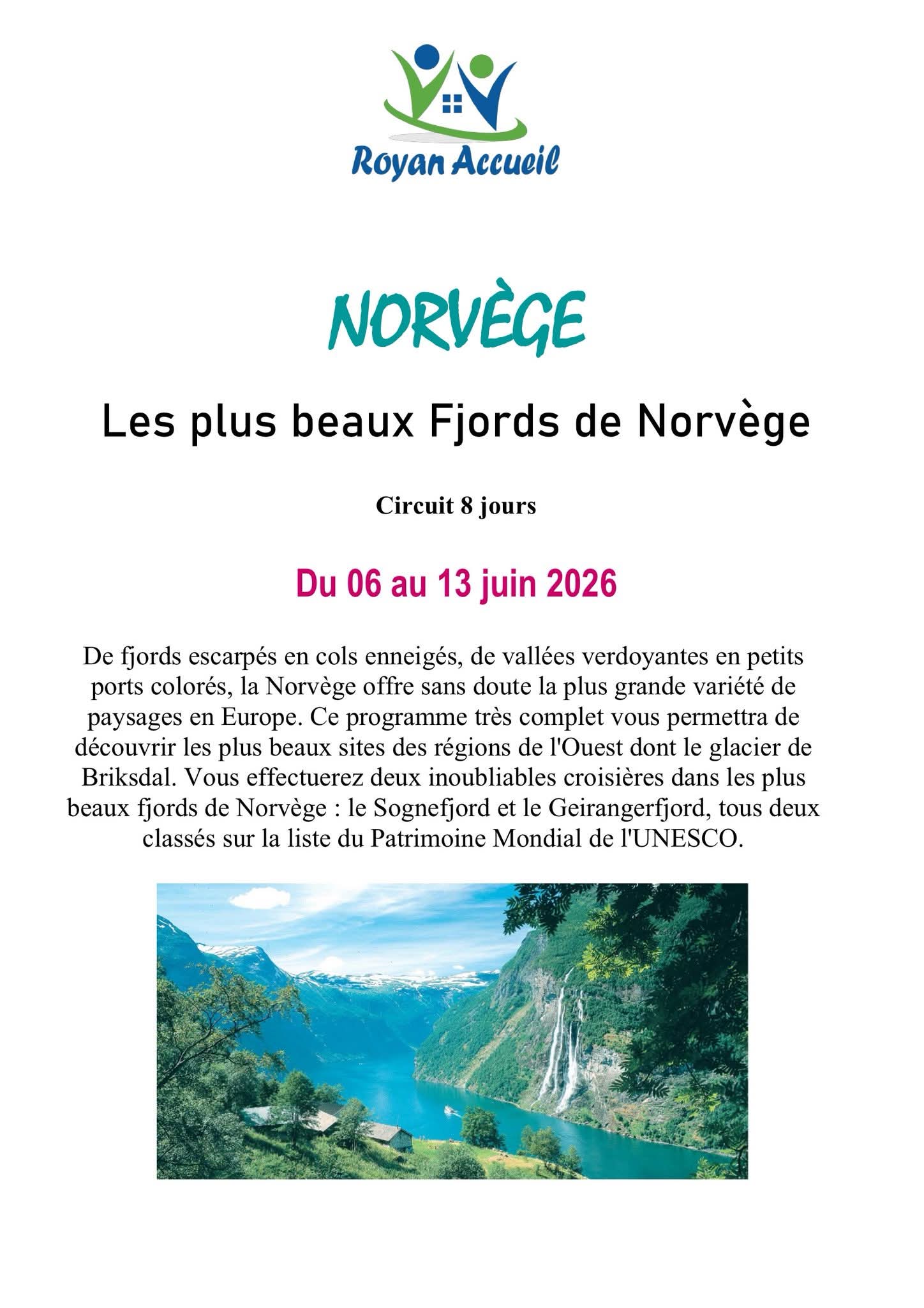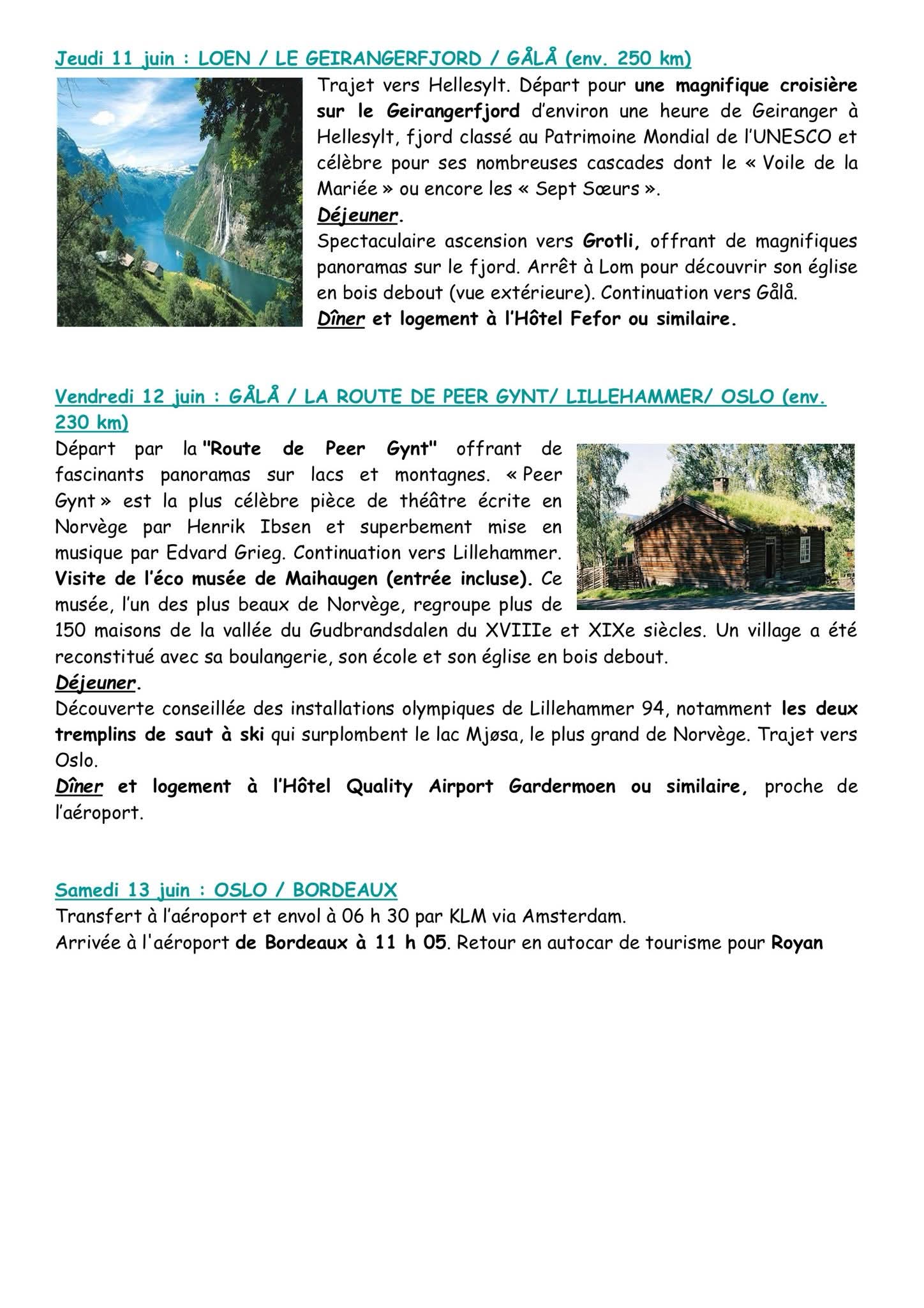 Voyage en NORVEGE du 6 au 13 Juin 2026 . Prix : 2 260 € / personne ( Voir Programme en pièce jointe ) Inscriptions le 23, 25 et 30 Septembre 2025 à l’Espace Royan Accueil , Rue Notre Dame 17 200 ROYAN ( 35 Participants maximum si plus de participants une deuxième date de voyage sera demandée .