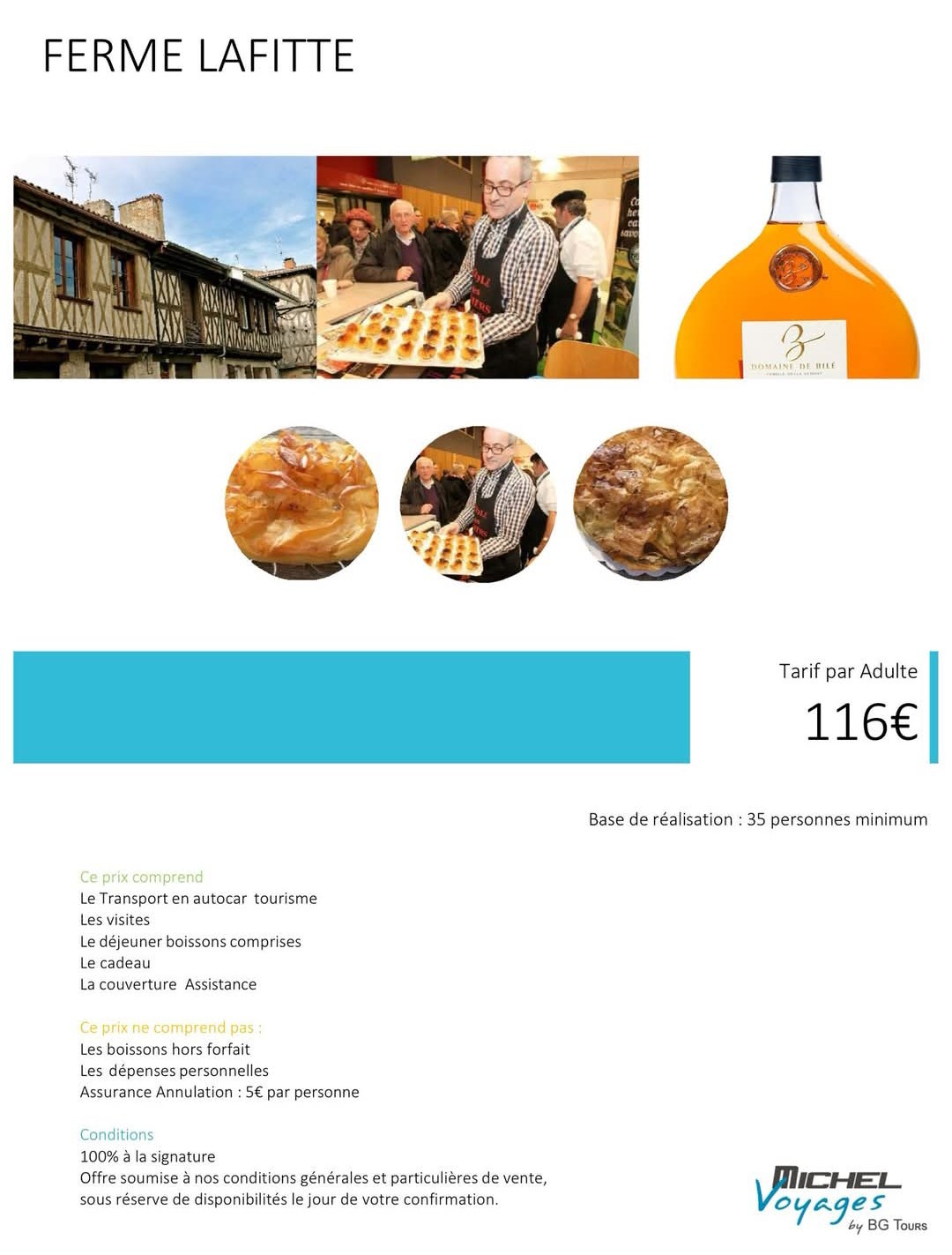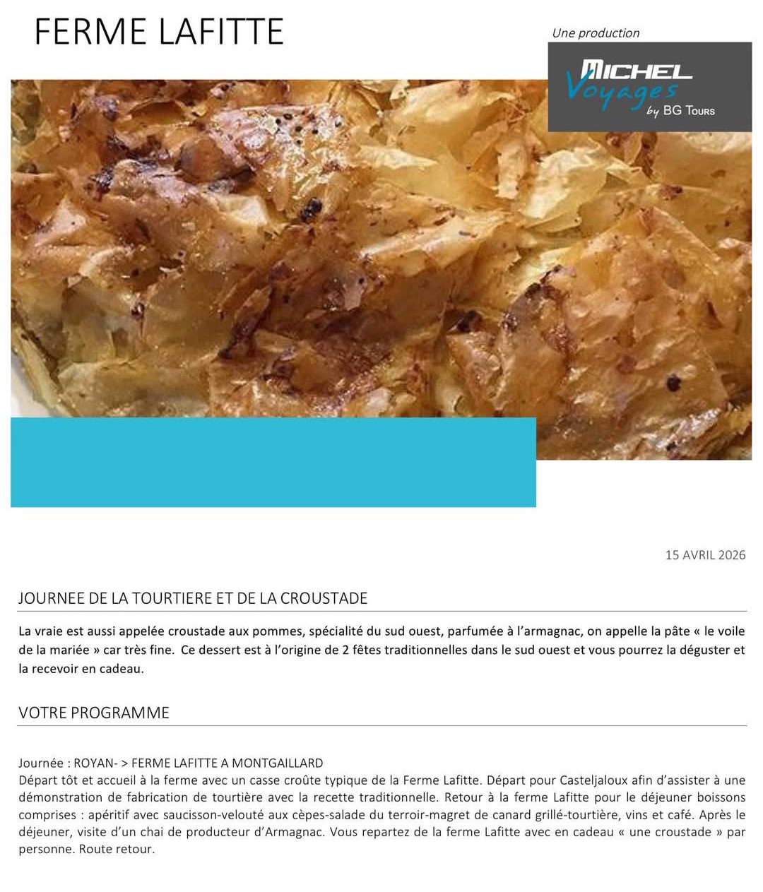 – FERME LAFITTE, le 15 Avril 2026. Prix: 116 € / Personne. ( 35 personnes minimum )(  Voir Programme de la journée ci dessous ). Inscriptions les 4, 6 et 13 Novembre 2025 à l’Espace Royan Accueil, 18 Rue Notre Dame 17 200 ROYAN.