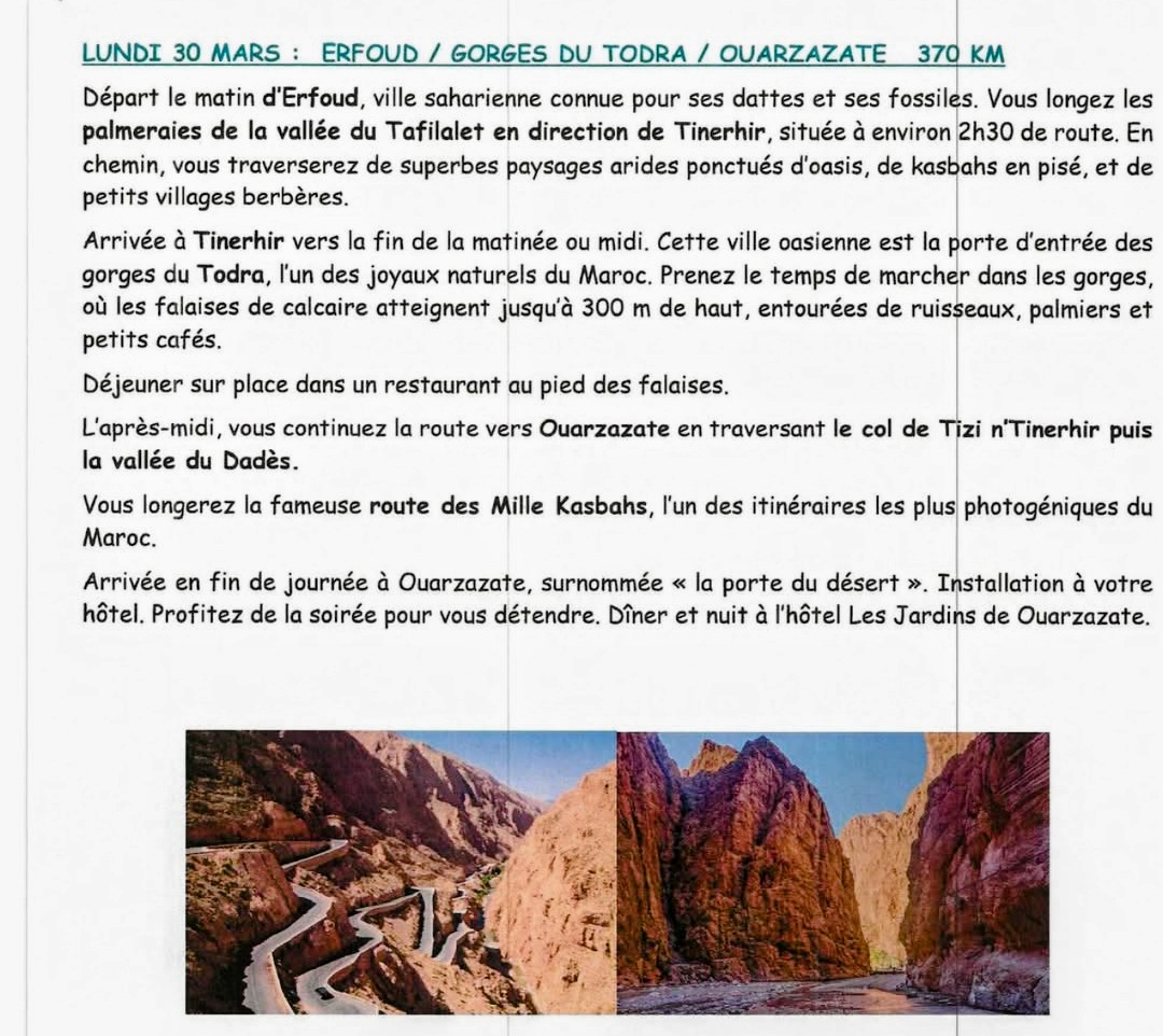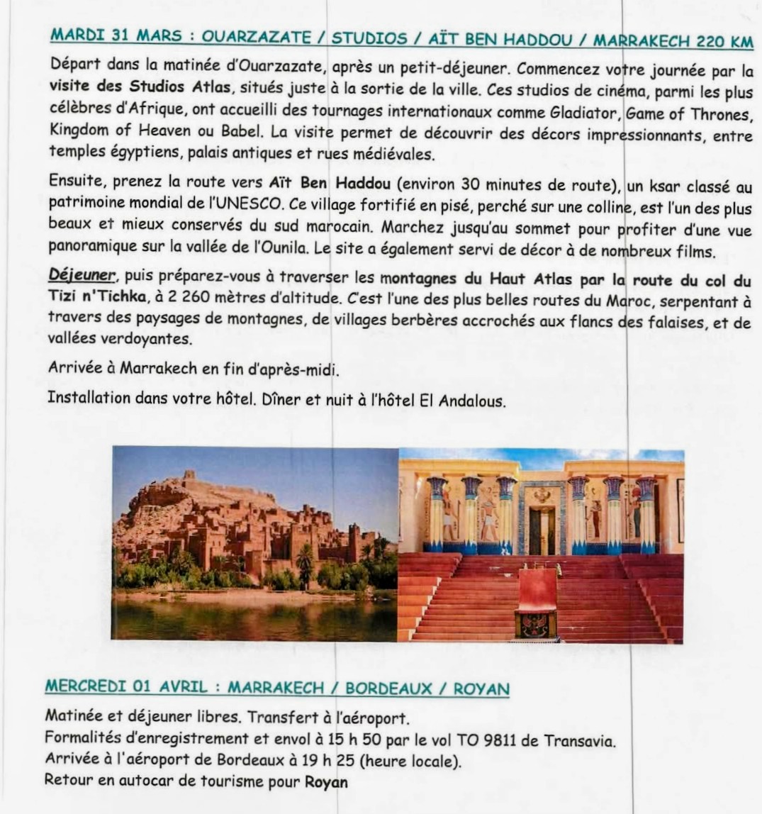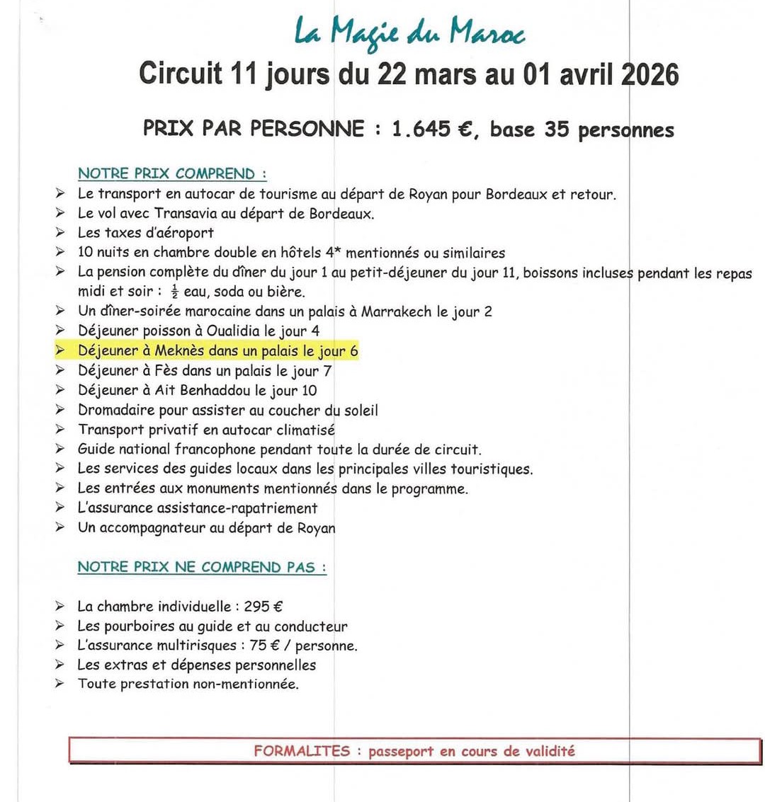 – MAROC du 22 Mars au 01 Avril 2026 . Prix : 1 645 € / personne. Il reste 4 places. Inscriptions les 4, 6 et 13 Novembre 2025 à l’Espace Royan Accueil, 18 Rue Notre Dame 17 200 ROYAN.