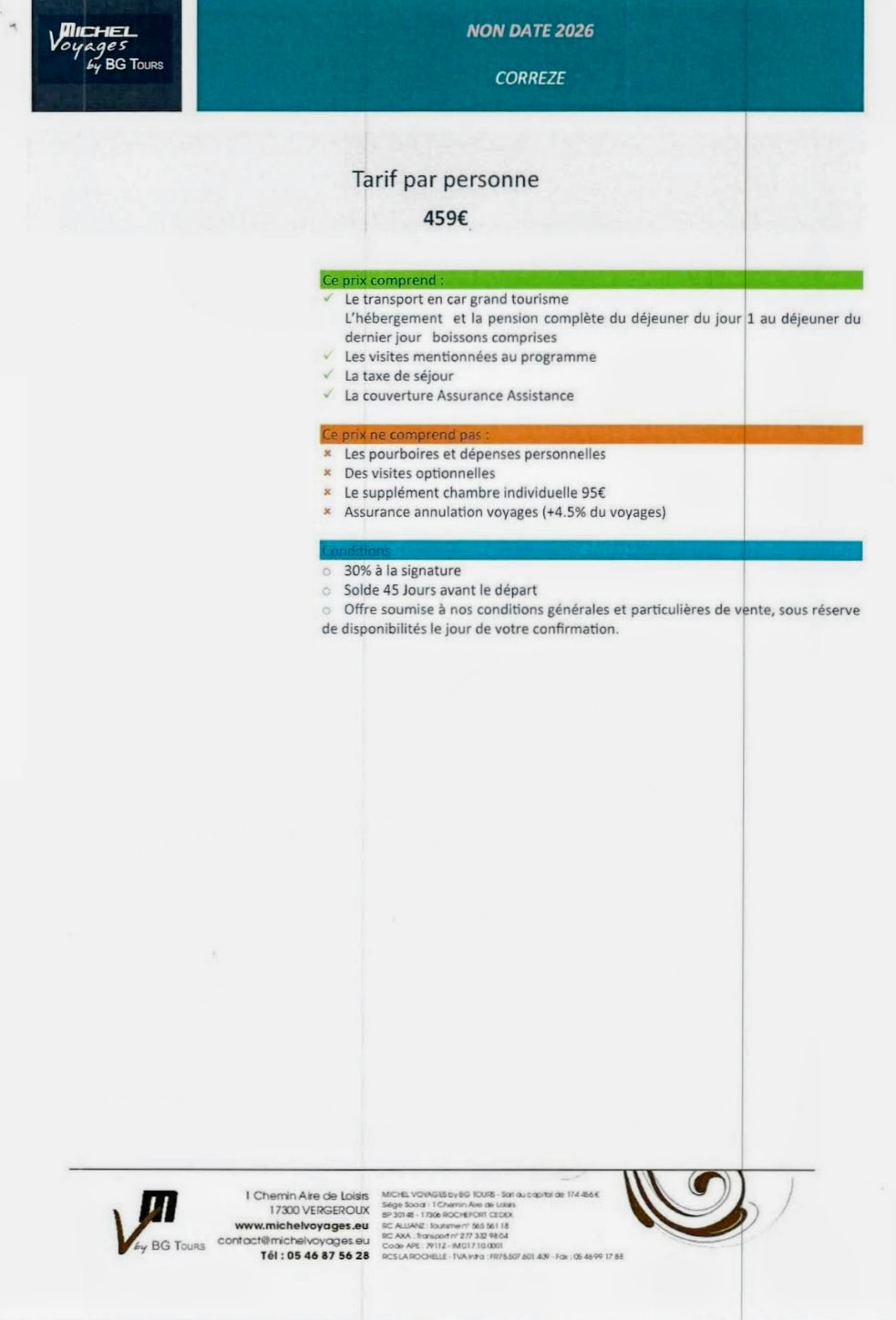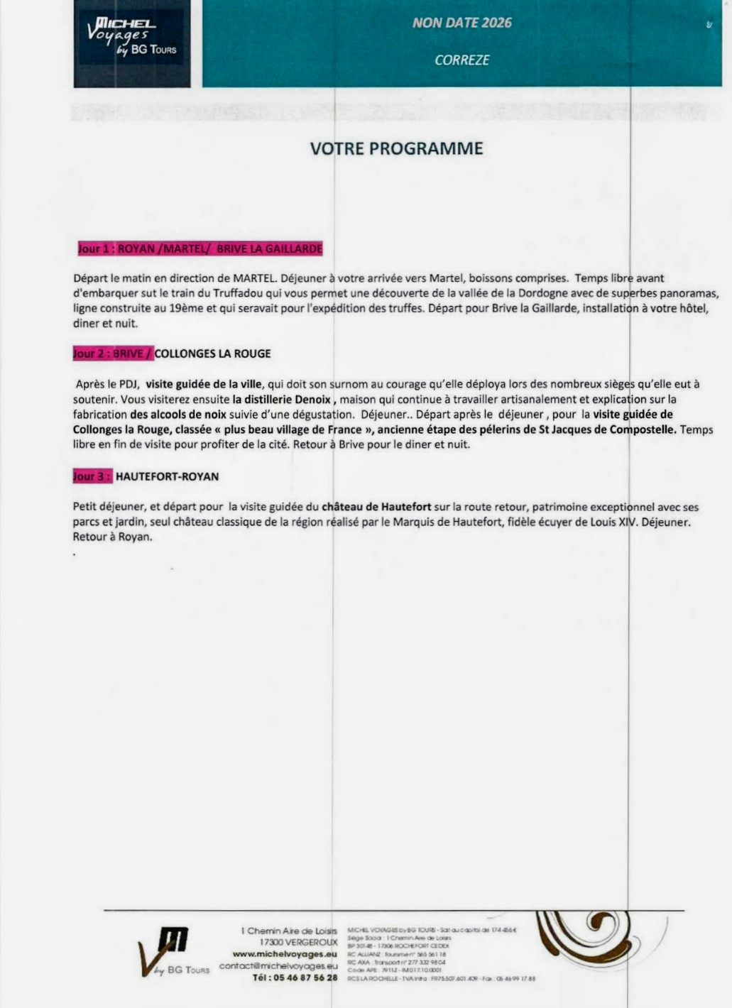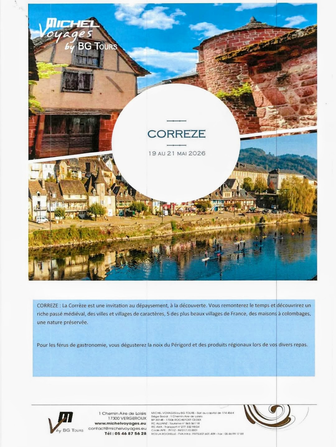 – CORREZE du 19 au 21 Mai 2026. Prix : 459 € / Personne. ( Voir Programme ci dessous ). Inscriptions les 4, 6 et 13 Novembre 2025 à l’Espace Royan Accueil, 18 Rue Notre Dame 17 200 ROYAN.