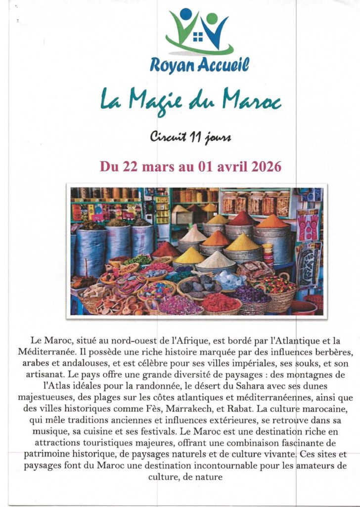Pour les Adhérents Royan Accueil MAROC du 22 Mars au 01 Avril 2026 . Prix : 1 645 €...