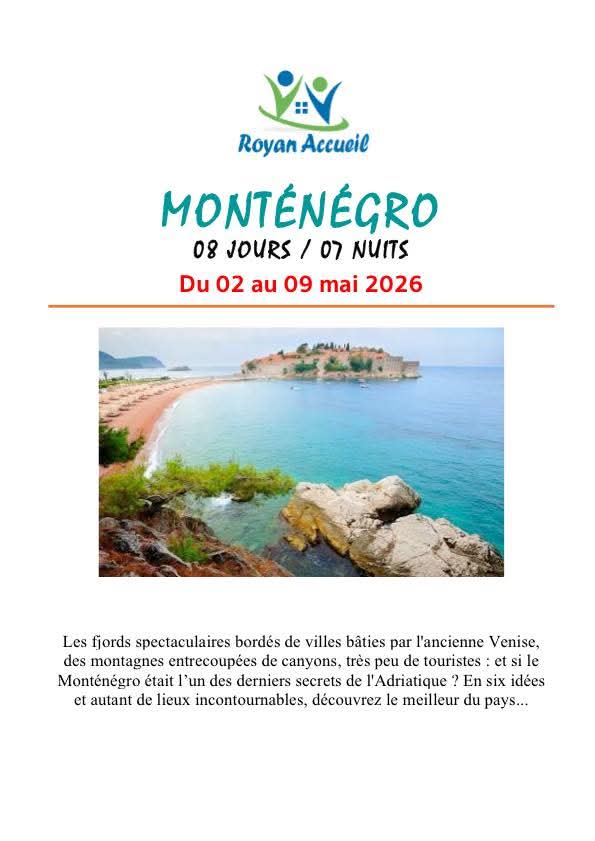 Pour les adhérents Royan Accueil MONTENEGRO du 2 au 9 MaI 2026 . Prix : 1 650 € /...