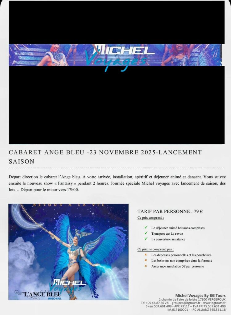 L’ANGE BLEU – Dimanche 23 Novembre 2025. Prix : 79 € / personne ( Voir Programme en pièce jointe...