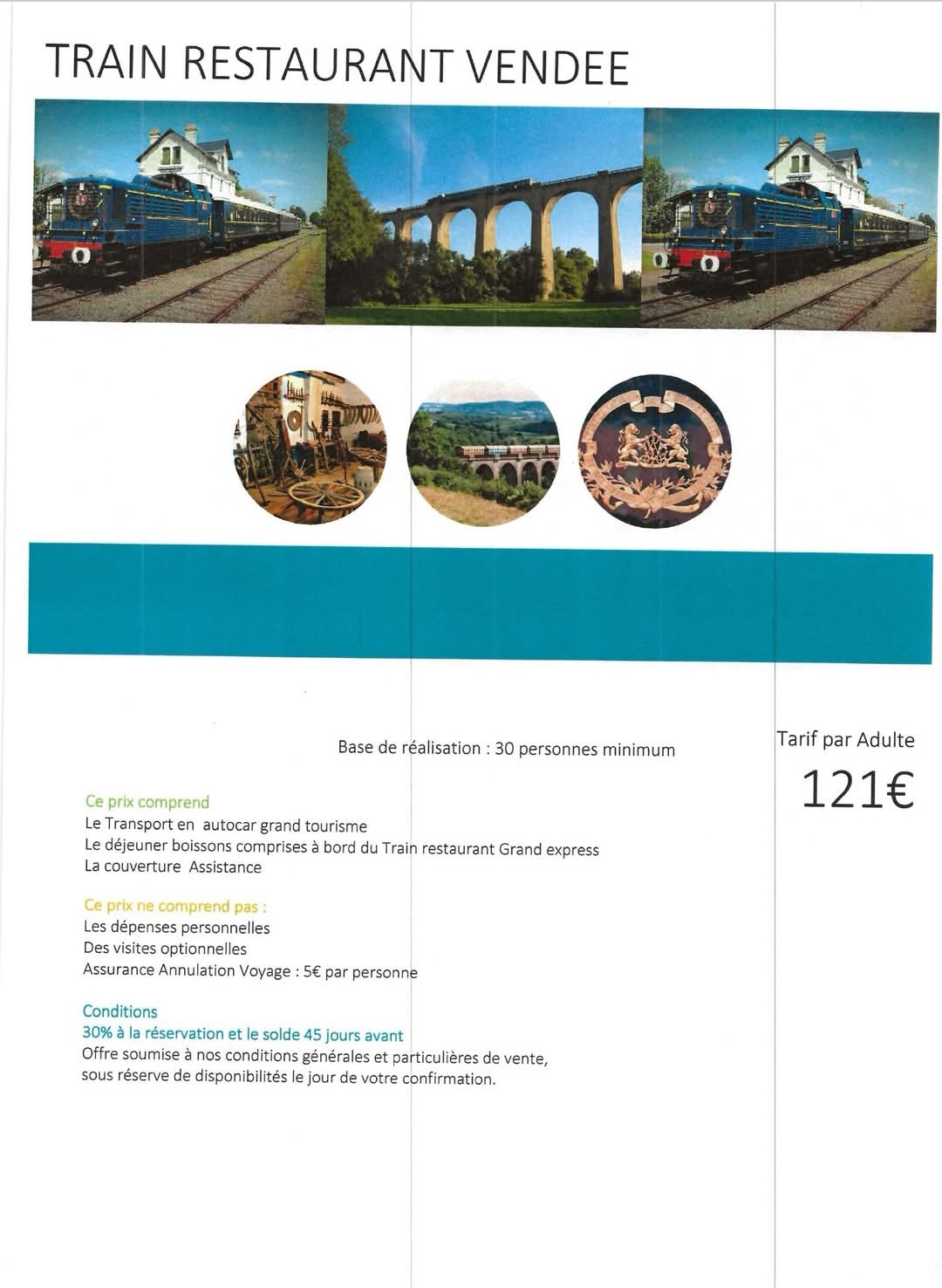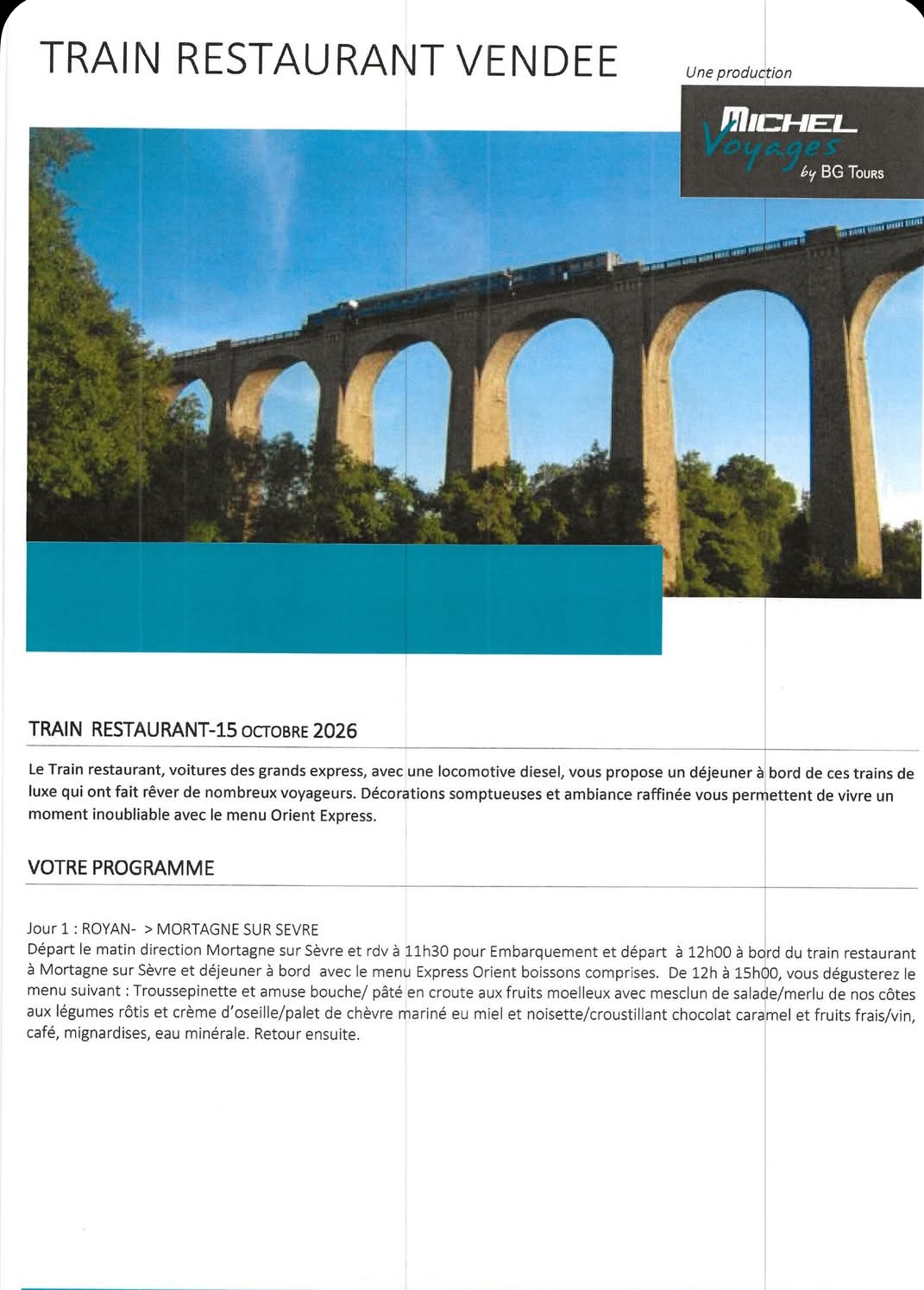 Je vous rappelle que nous faisons les inscriptions pour la sortie journalière ´ le train restaurant de Vendée ´ le vendredi 20 février et mardi 24 février 2026 à la maison des associations de 14h à 17h.